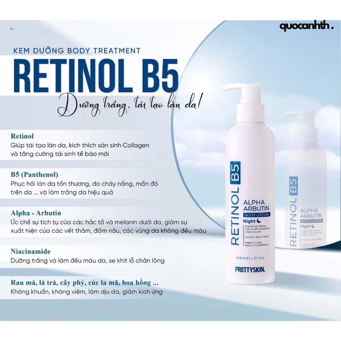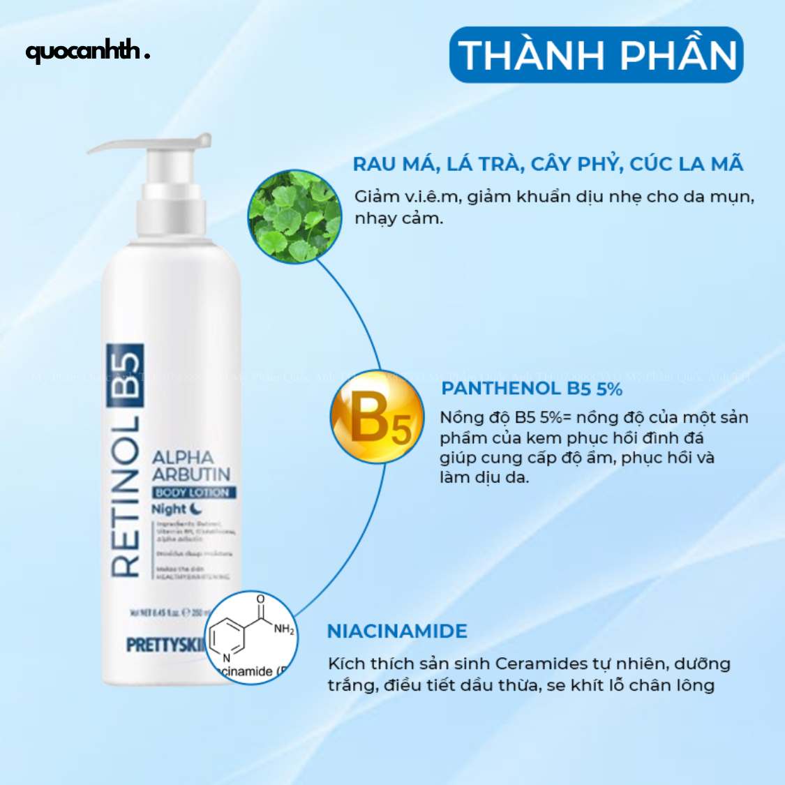 Kem Dưỡng Thể Trắng Da Ban Đêm Body Treatment Pretty Skin Retinol B5 Alpha Arbutin Body Lotion có chứa các thành nổi bật như: