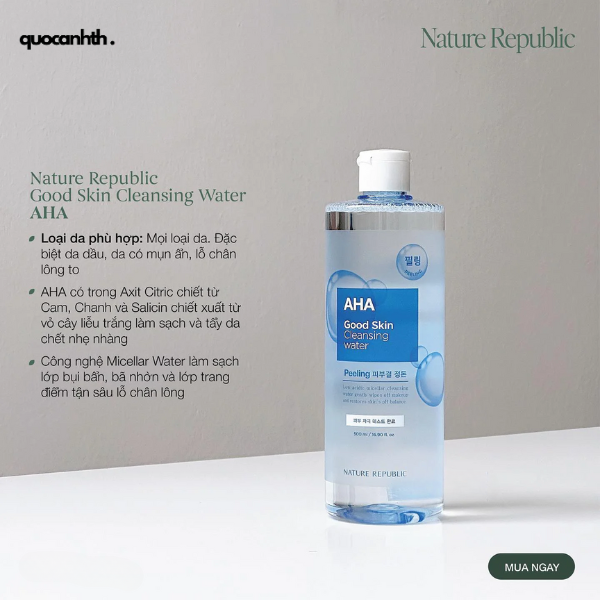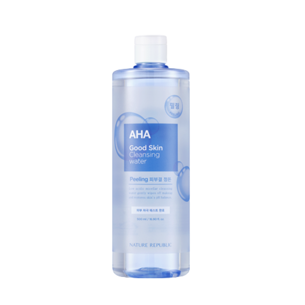 1. Nature Republic AHA Good Skin Cleansing Water - Peeling 500ml - chiết xuất AHA giúp loại bỏ tế bào chết nhẹ nhàng và làm sáng da.