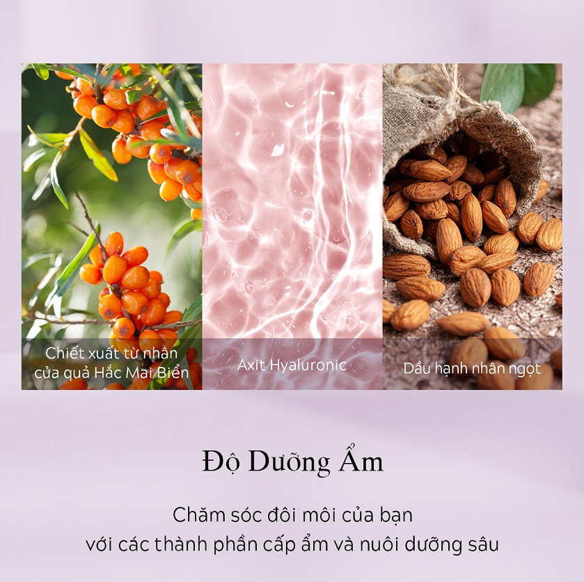 Hàm lượng dưỡng chất có tính dưỡng ẩm cao giúp đôi môi ẩm mượt, không bị khô ngay cả khi không dùng son dưỡng.